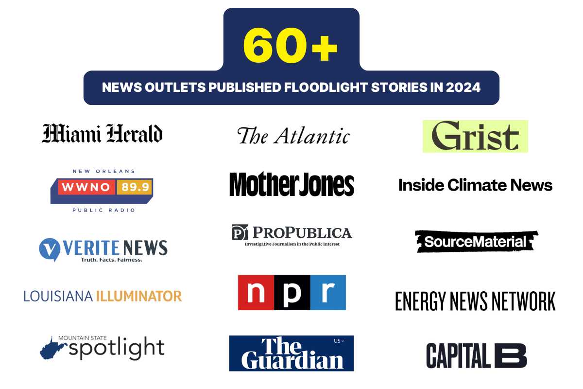 In 2024, more than 60 news outlets republished Floodlight stories. We collaborated with national news organizations including The Guardian, The Atlantic, Mother Jones, NPR and ProPublica.