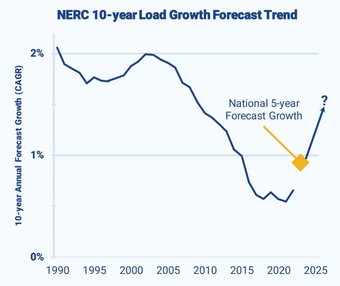 After more than 30 years of falling or flat demand for electricity, electric utilities are forecasting the nation will need the equivalent of about 34 new nuclear plants, or 38 gigawatts, over the next five years to supply power for data centers, electrification and new industry, according to filings made to the Federal Energy Regulatory Commission and compiled by Grid Strategies.