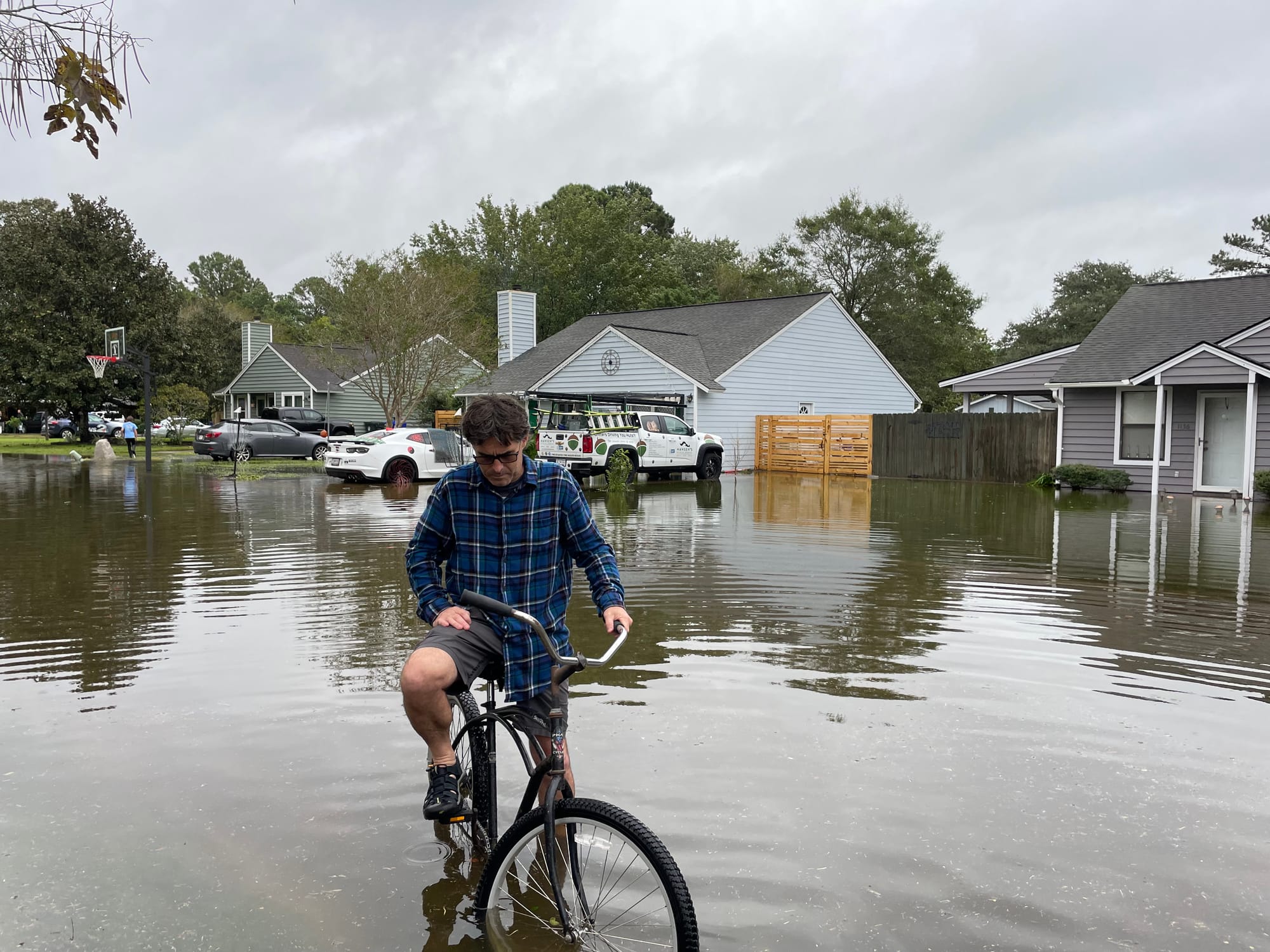 Images left to right: A 2016 flood turned much of Charleston’s Bridge Pointe community into a lake. After four floods in three years repeatedly damaged the Bridge Pointe townhomes, the city of Charleston and the federal government bought out the community’s 32 homes. (Photo courtesy of John Knipper) / Darin Jones bikes on Shoreham Road after Hurricane Ian flooded the street in 2022. Jones and his wife, Ana Zimmerman, once lived on the street but moved after their home repeatedly flooded. Zimmerman predicts that entire neighborhoods will have to move as the sea level rises and storms grow more intense. (Photo courtesy of Ana Zimmerman) / Ann Auburn and her husband moved from their historic Charleston home because they were fed up with the floods that repeatedly damaged and threatened the house. This photo, taken from across Gadsden Street, shows the floodwaters surrounding Auburn’s house in September 2017. (Photo courtesy of Ann Auburn.)