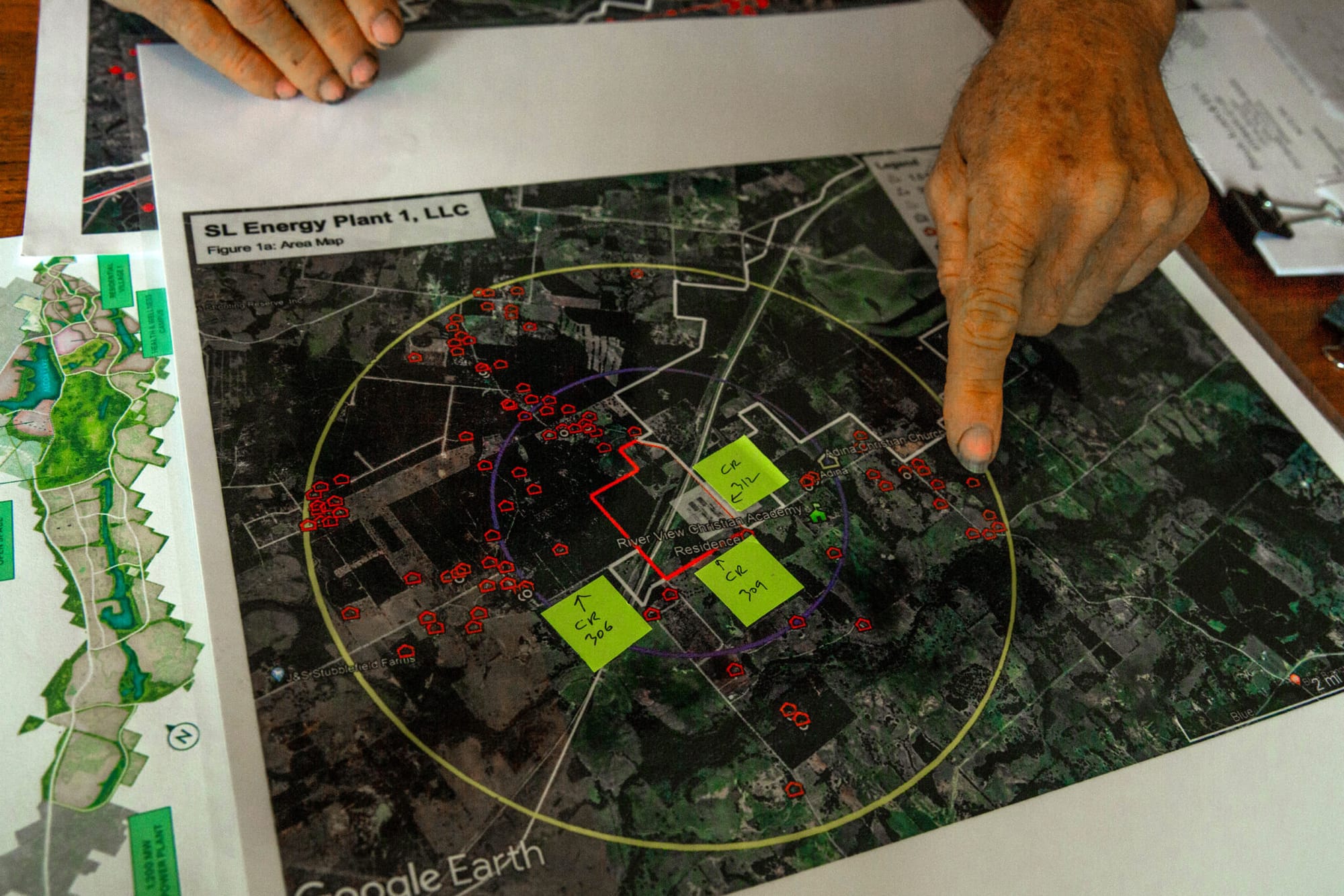 Left: Hugh Brown points to his home on a map of the 1,200 MW gas plant proposed by Sandow Lakes Energy Co. Credit: Dylan Baddour/Inside Climate News. Right: Brown stands next to a pond on his property ringed with cypress trees he planted 30 years ago. Credit: Dylan Baddour/Inside Climate News