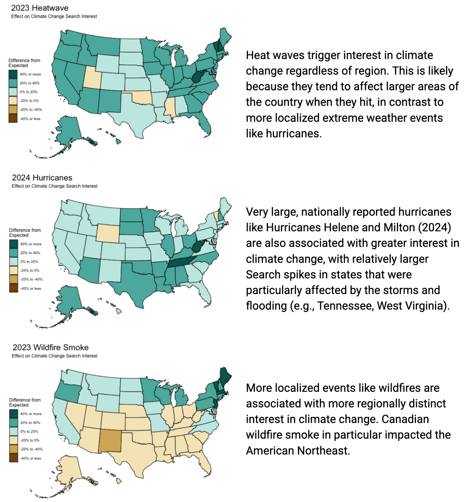 “Certain weather events — like heat waves — seem to produce consistent jumps in climate change interest across all regions simultaneously,” the researchers wrote, “while others — like wildfires — show more geographic variation.”