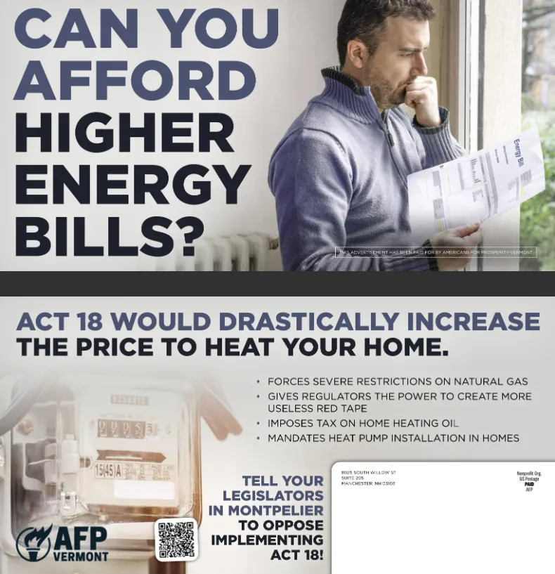 But Americans for Prosperity opposed Act 18 and in May 2024 launched âa major five-part mail and digital campaignâ that initially cost more than $63,000, according to the groupâs disclosures. Another group within the state, Vermonters for Affordable Heat, supported by the stateâs locally owned fuel dealers, spent around $11,300 on postcards and a petition opposing the law.