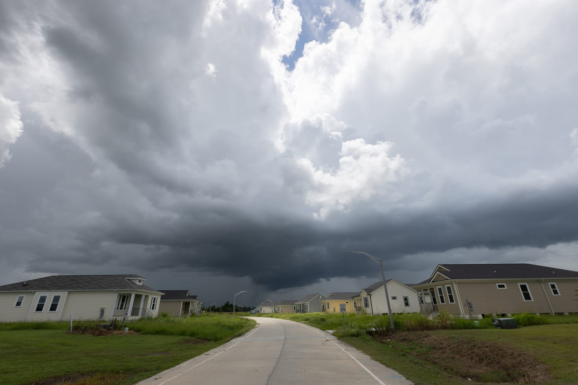 This is an aerial view of The New Isle outside of Gray, La., about 40 miles north of the Isle de Jean Charles, a community disappearing due to erosion and climate-fueled storms along the Louisiana coast. In 2016, the state received $48.3 million in federal funding to relocate 37 people or families living on the “old isle.” (Evan Simon / Floodlight) | Dark clouds hang over The New Isle de Jean Charles resettlement on June 24, 2025. (Jeffrey Basinger / Floodlight)