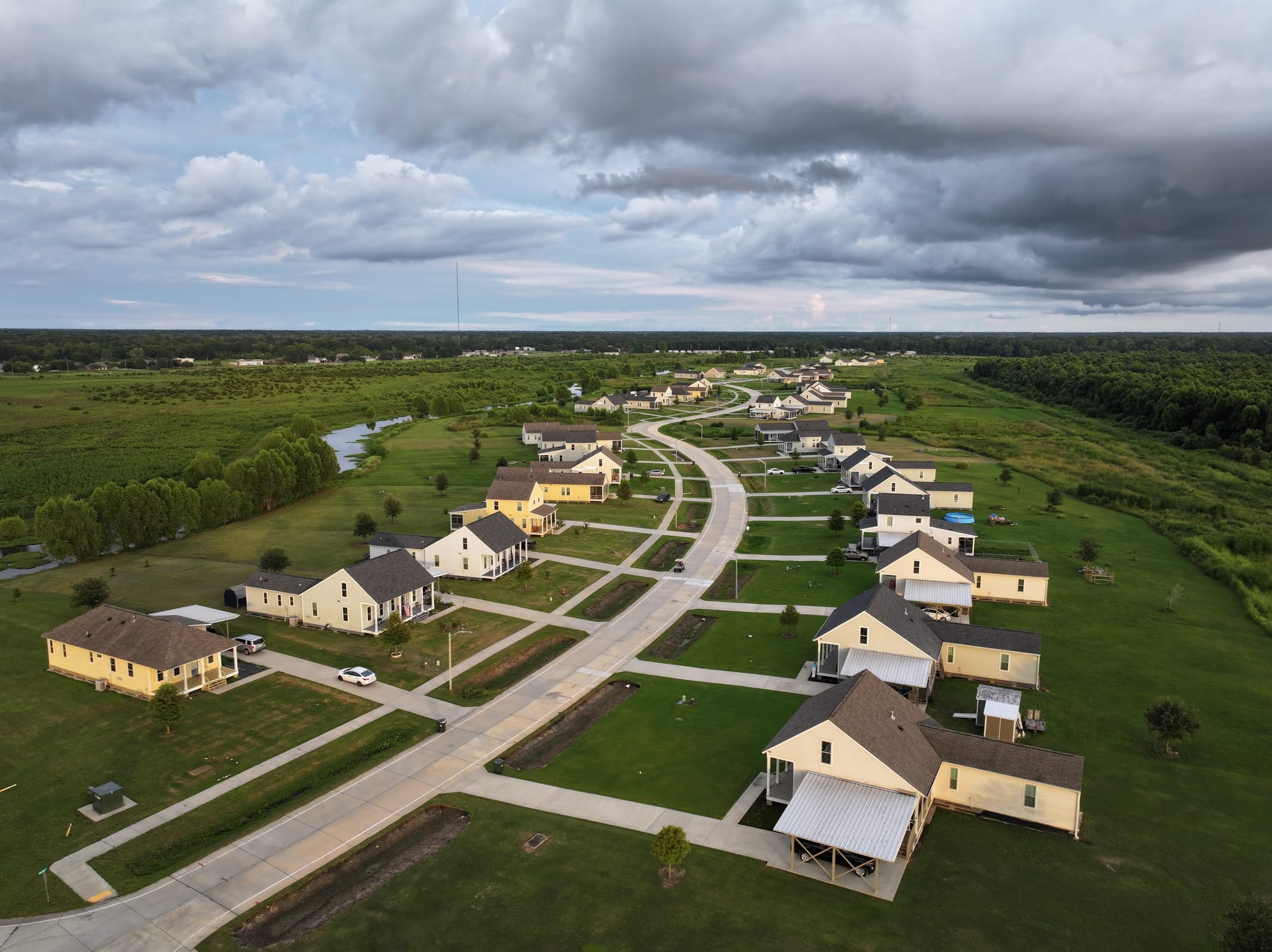This is an aerial view of The New Isle outside of Gray, La., about 40 miles north of the Isle de Jean Charles, a community disappearing due to erosion and climate-fueled storms along the Louisiana coast. In 2016, the state received $48.3 million in federal funding to relocate 37 people or families living on the “old isle.” (Evan Simon / Floodlight) | Dark clouds hang over The New Isle de Jean Charles resettlement on June 24, 2025. (Jeffrey Basinger / Floodlight)