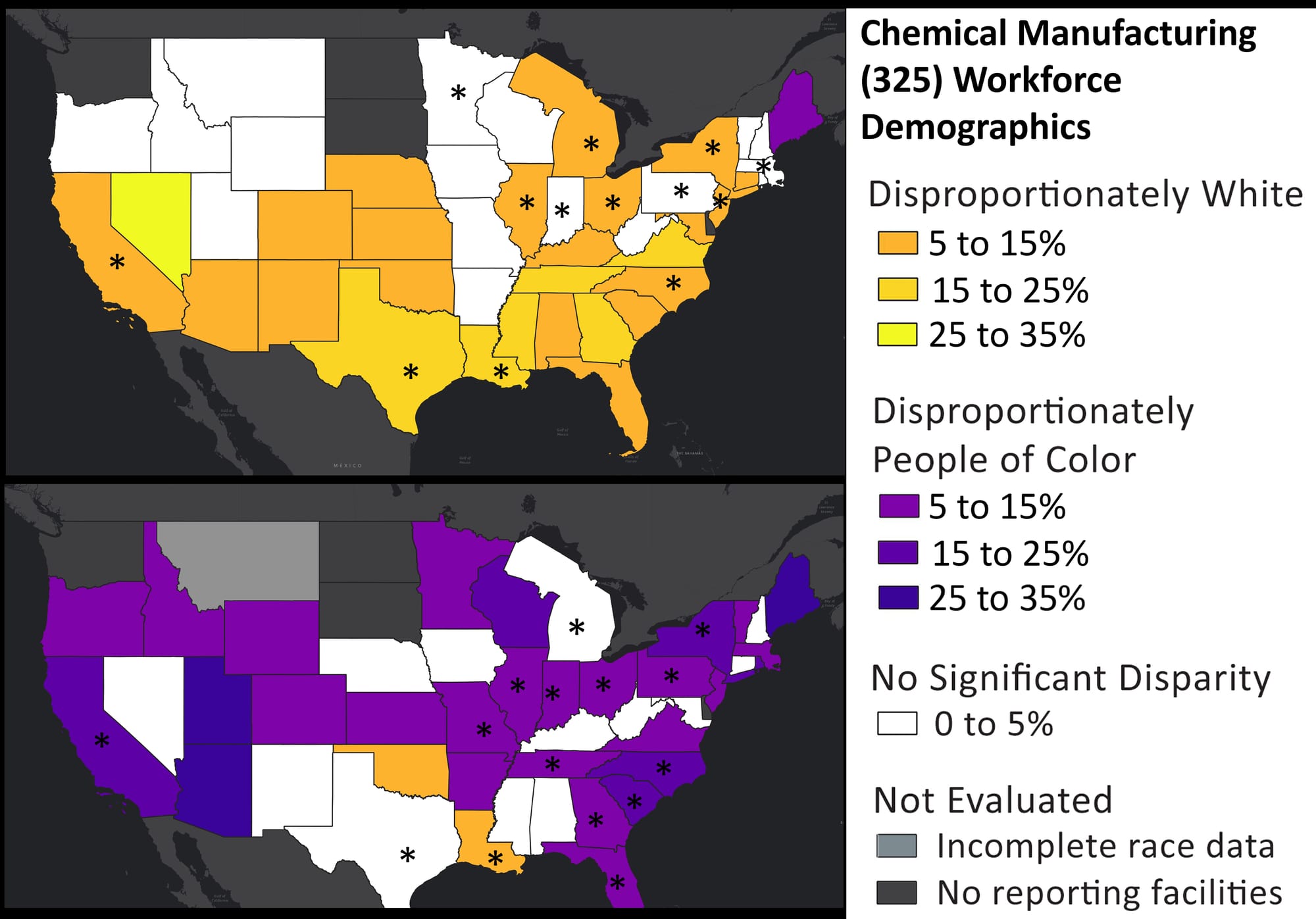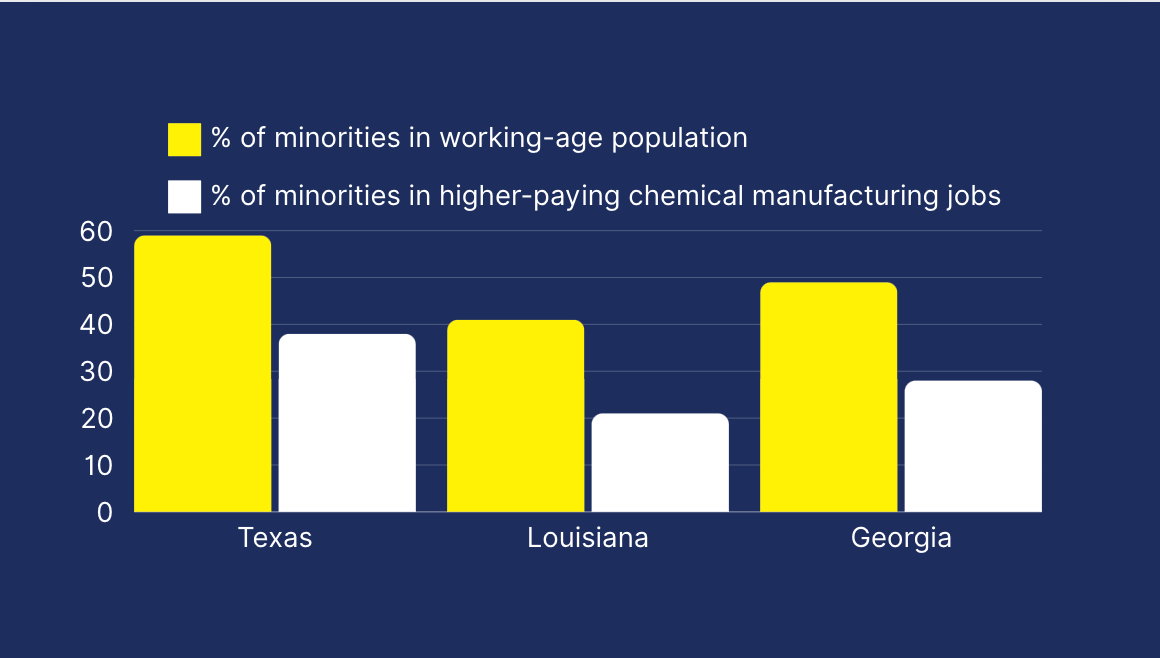 Nationally, higher paying jobs in the chemical manufacturing industry disproportionately went to more white people in Texas, Louisiana and Georgia where minorities represent 59%, 41% and 49% of their respective states’ populations but held 38%, 21% and 28% of the better paid jobs within the industry.